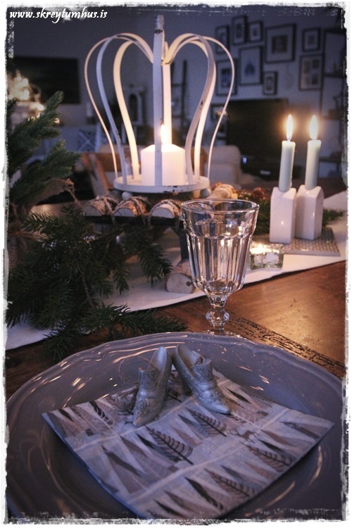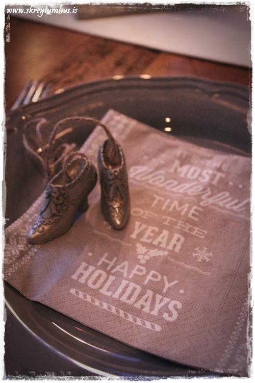 …mér þætti nú ekki leiðinlegt að setjast til borðs, að það væru svona fínir skrautskór á diskinum mínum 😉 Takið líka eftir hvað það er dásamlegir litir í þessum jólatrjám á servéttunum…