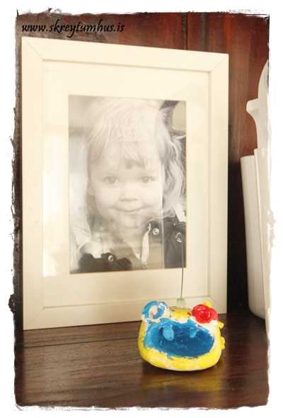 …þessi dásemdarfiskur kom úr jólapakkanum hjá dótturinni og var gerður af henni í skólanum. Hann er í efstu hillunni líka ásamt einni af uppáhaldsmyndunum mínum af henni…