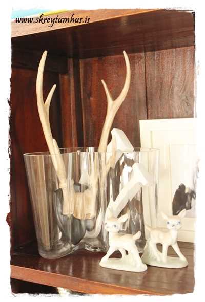 …í hillunni fyrir neðan hvílir glæri Alvar Aalto vasinn minn, og í honum er síðan Broste-hornin, sem eru nú komin niður af vegg. Bambakrúttin frá Fröken Blómfríði kúra síðan við hliðina…