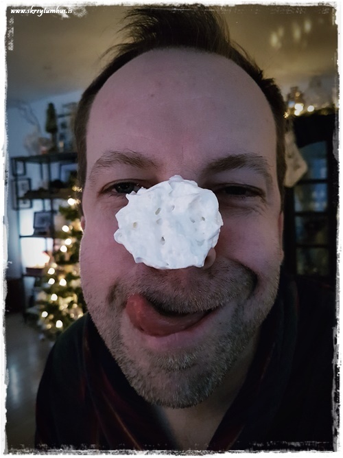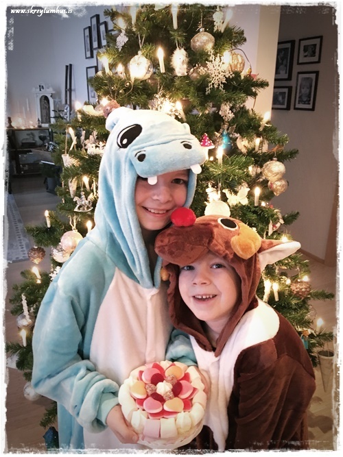 …í pökkunum voru síðan þessir gallar, sem voru mjög svo skemmtilegir, og af því að jólasveinarnir eru alltaf pínu óþekkir og gefa dót sem mömmur og pabbar myndu ekki gefa – þá var svona sælgætiskaka (((hrollur)))…