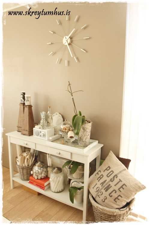 …litla hliðar borðið hýsir hitt og þetta, að vanda. Ég komst líka að því að það er snilld að skella bara einum sætum púða ofan í körfuna og hann felur þá blaðarusleríið sem að safnast saman þarna…