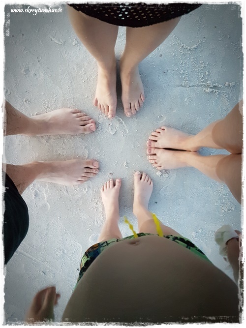 Klukkan var alveg að verða sjö að kveldi, og því orðið ansi áliðið.  Þarna hafði greinilega ekki rignt neitt, og veðrið auðvitað dásamlegt.  Krakkarnir voru með sundfötin sín og við gengum í fjörunni og alveg út í sjóinn.  Hann var hreint yndislegur, heitur eins og baðvatn.