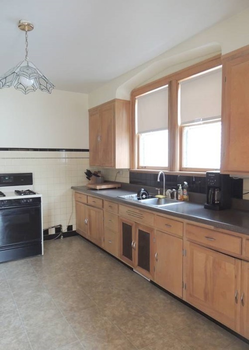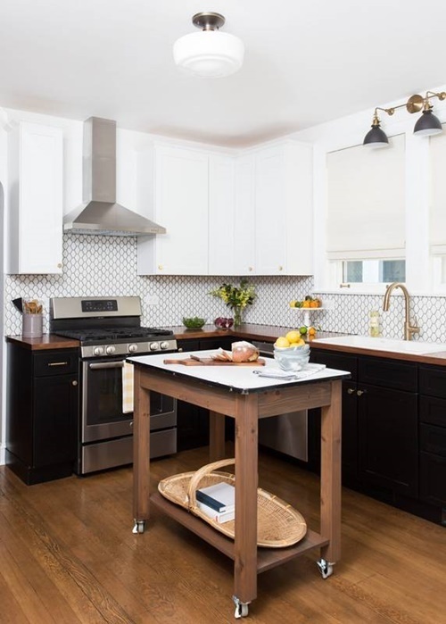 …áður var gluggi á vegginum við hurðina, en honum var fórnað til þess að fá betra skipulag. Stundum þar að velja og hafna. Eins bættu þau við eyju á hjólum, sem er hrein snilld í eldhúsum til þess að bæta við vinnuplássi…