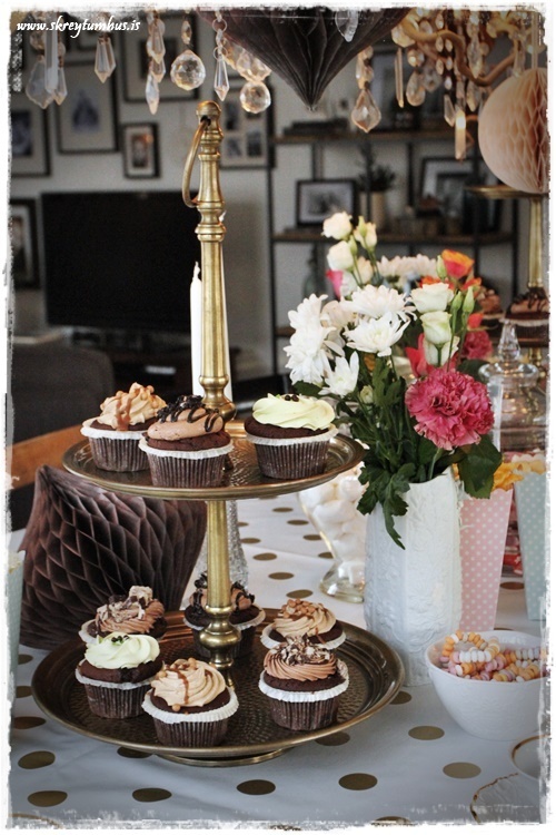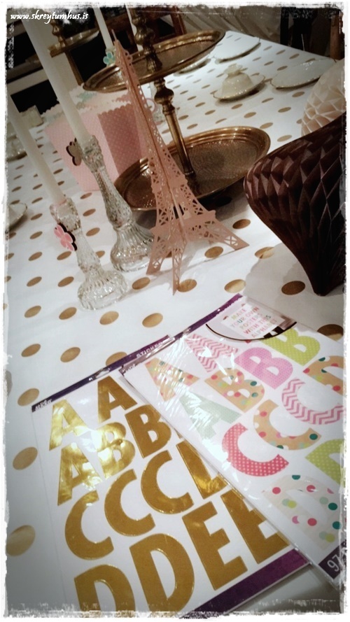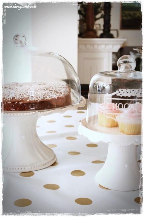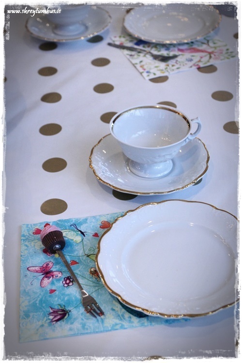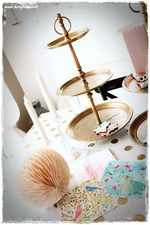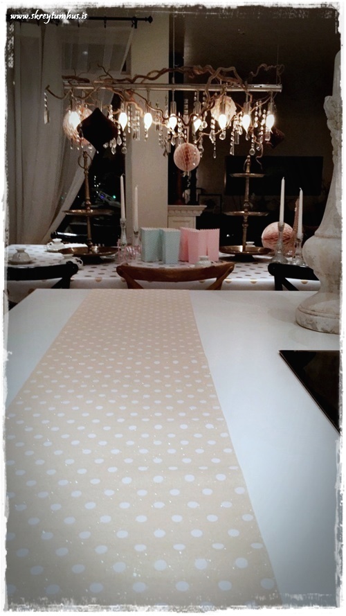 Eins og vanalega fór ég hringinn, kíkti í Söstrene og í Tiger, Ikea og þess háttar. En ég var að leita að einhverju sem myndi gefa innblástur og það fannst ekki fyrr en ég fann dúkinn góða. Hvítur plastdúkur með gylltum doppum sem er seldur í metravís og því alveg kjörinn í svona veislur.