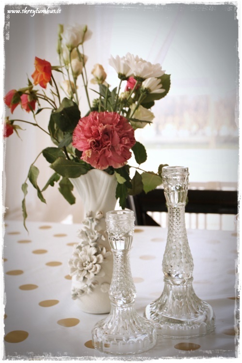 …ég fann þessa fallegu kertastjaka í Rúmfó líka, en þeir voru á 300 og eitthvað kr stk.  Sem sé ekki dýrir en til í nokkrum litum.  Mér finnst þeir alveg ferlega fallegir.  Blómavasinn var síðan úr Góða Hirðinum og ég spreyjaði hann bara hvítann…