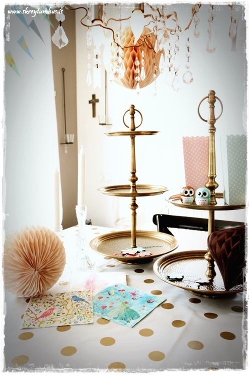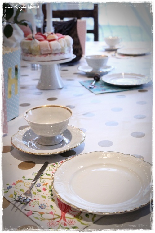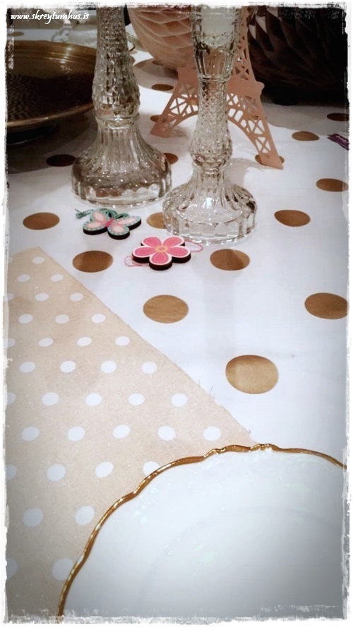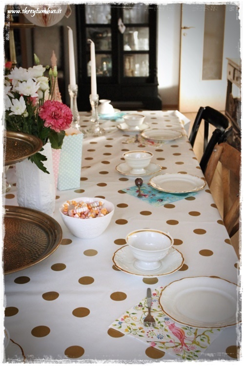 Eins og vanalega fór ég hringinn, kíkti í Söstrene og í Tiger, Ikea og þess háttar.  En ég var að leita að einhverju sem myndi gefa innblástur og það fannst ekki fyrr en ég fann dúkinn góða. Hvítur plastdúkur með gylltum doppum sem er seldur í metravís og því alveg kjörinn í svona veislur.
