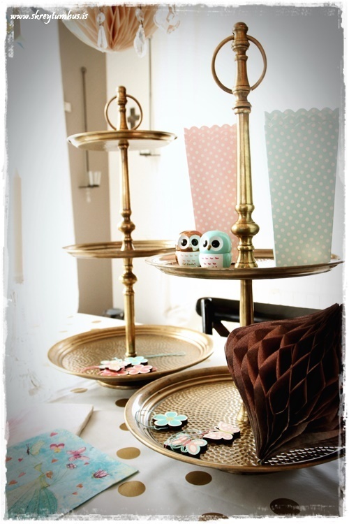 …kökudiskarnir eru úr ýmsum áttum.  Sá stærri er úr Kaupfélaginu á Hvammstanga, en hatturinn er af Ikea kökudiskinum.  Það er nefnilega um að gera að máta þetta fram og til baka og sjá hvað kemur út þegar þið leikið ykkur smávegis að því sem til er fyrir.  Minni diskurinn er síðan úr Litlu Garðbúðinni…