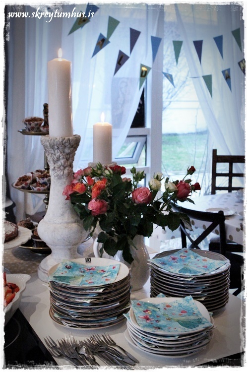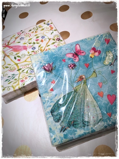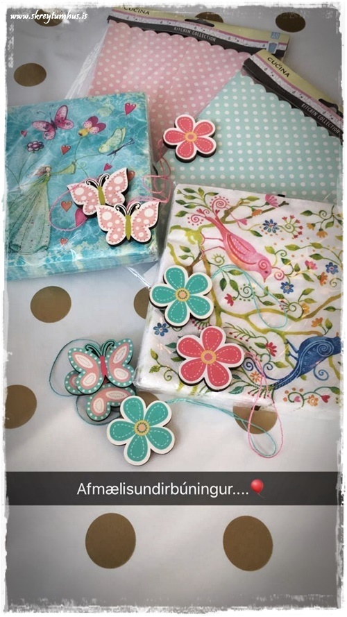 Restina af dótinu fann ég svo líka í Rúmfó, en það voru þessi hérna snakkbox, fallegar servéttur og lítil skrautfiðrildi og blóm…