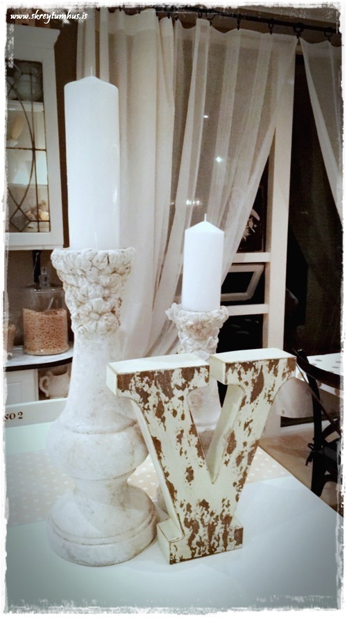 …ég fann þessa fallegu kertastjaka í Rúmfó líka, en þeir voru á 300 og eitthvað kr stk. Sem sé ekki dýrir en til í nokkrum litum. Mér finnst þeir alveg ferlega fallegir. Blómavasinn var síðan úr Góða Hirðinum og ég spreyjaði hann bara hvítann…