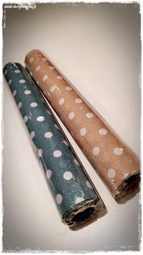 Það er nefnilega oftast þannig að ég fer af stað með mjög óljósa, eða nánast enga hugmynd, í kollinum fyrir svona veislur og finn eitthvað eitt sem að hendir mér á rétta braut. Í þetta sinn var það dúkurinn sem ég fann sem sé í Rúmfó. Hann kemur í metravís en ég sé hann alveg fyrir mér klipptan niður í t.d. renninga eða löber-a fyrir fermingarveislur og þess háttar. Hann er alveg æðislegur!