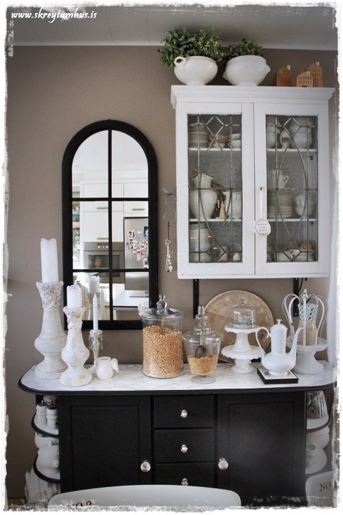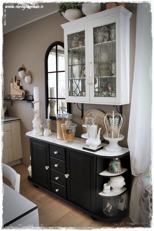 Virkilega flott..held að það kæmi vel út að hafa hillurnar svartar í stað marmara..poppar upp skrautið í þeim eins og sést inni skápnum 😊