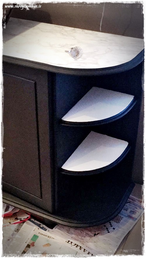 …ég hélt tveimur hillum hvítum, það er ekki pörfekt, en planið er að skera úr marmarafilmu á þær rétt eins og á toppinn…