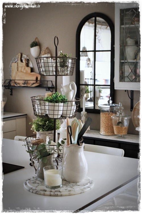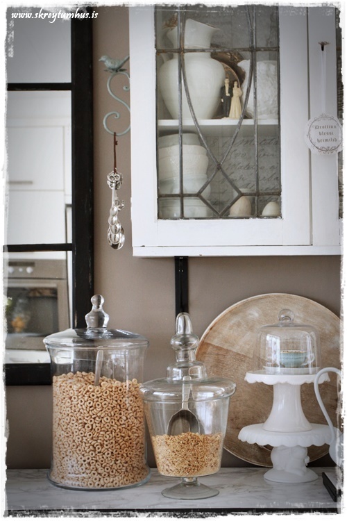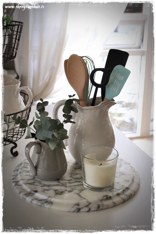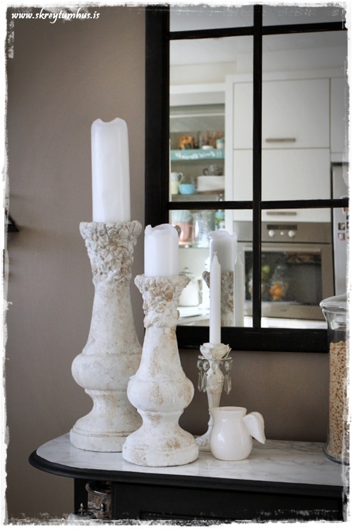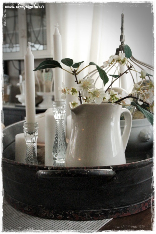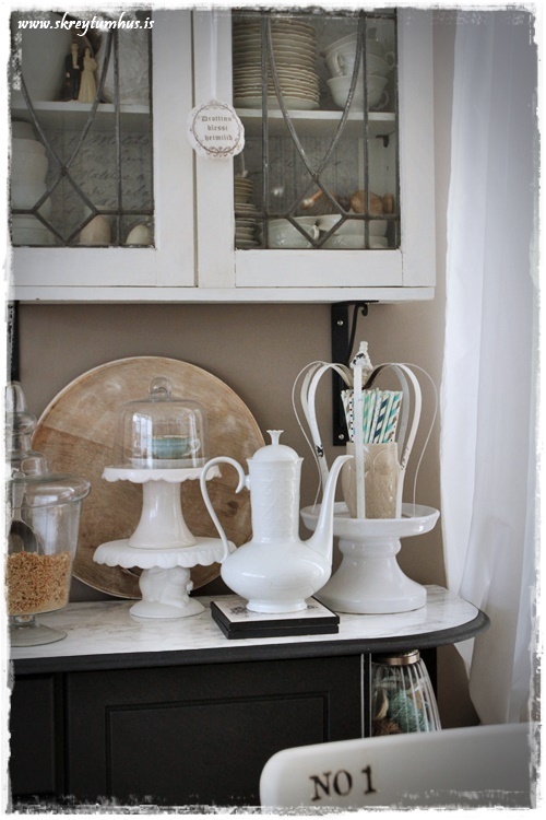 …ofan á skenkinum er sem endranær samansafn af hinu og þessu. Hvítir kökudiskar á fæti er í uppáhaldi og auðvitað hvítar könnur og þetta stendur því í heiðurssessi…