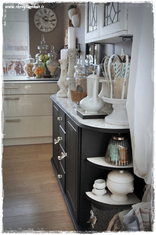 Hrikalega flott eins og alltaf! Svolítið fyndið samt, að maður tekur meira eftir svörtu hlutunum í eldhúsinu eftir að þú málaðir skenkinn 🙂 Kemur mjög vel út 😀
