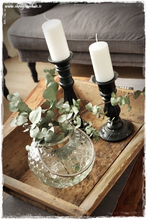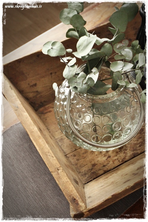 …og af því þetta er svona gamalt og þreytt, þá er einmitt svo fallegt að setja glæra vasa, nú eða hvíta, í bakkann og sjá þá njóta sín…