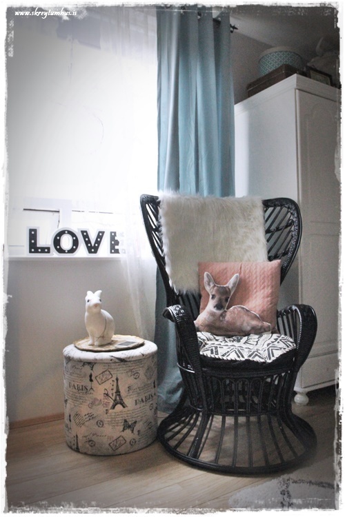 …og nýji DIY-körfustóllinn er kominn á betri stað og nýjar ljósbláar og dásamlega fallegar gardínur…