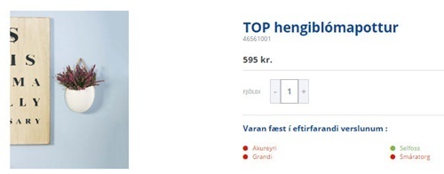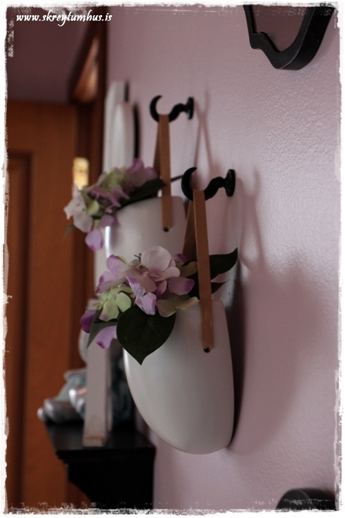 …í vegggrúbbuna okkar voru settir TOP-veggblómapottarnir, og við settum þá á króka sem fást í Rúmfó líka og kostuðu 100kr pk með tveimur…