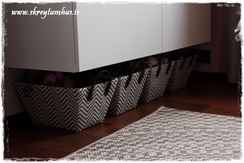 …undir rúminu settum við Stars-geymslukörfurnar fyrir bangsa og annað slíkt. Við notuðum ljósgrá/beislituðu körfurnar, og þær pössuðu fínt við gardínurnar og mottuna. Allt passar, án þess að vera of mikið allt eins og of mikið í stíl (það er hægt sko)…
