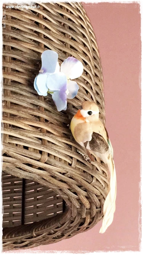 …og klippti nokkur blóm af skrautblómunum og stakk inn á milli og svo settum við líka fugla með…