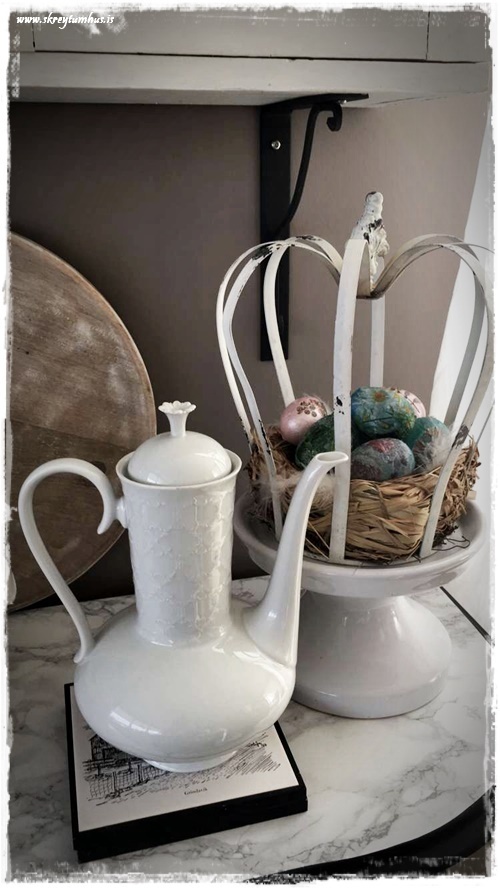 …eins skellti ég nokkrum eggjum sem ég föndraði með sömu aðferð og hér (smella) nema í bláum tónum í hreiður sem ég stillti upp á skenkinn…