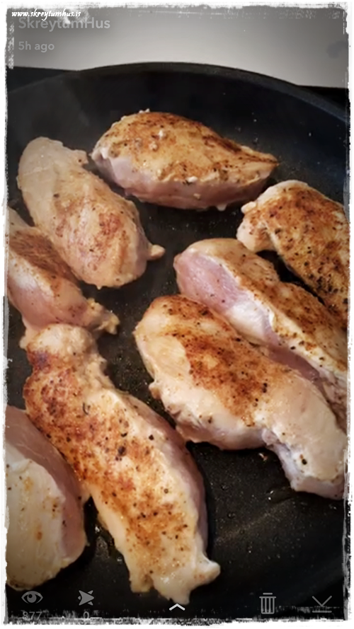 osturinn bræddur saman við rjómann. Kjúklingabringur skornar og steiktar á pönnu með dass af olíu, svona til þess að loka öllu hliðum og kryddaðar með kjúklingakryddinu.