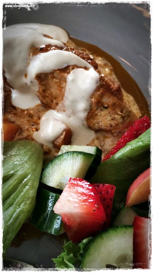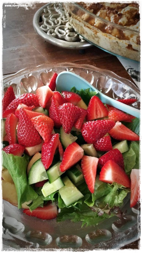 Við vorum svo bara með ferskt salat með, ásamt því sem var til í skápnum. Sem í þetta sinn var kálblanda, gúrkur, epli og jarðarber.