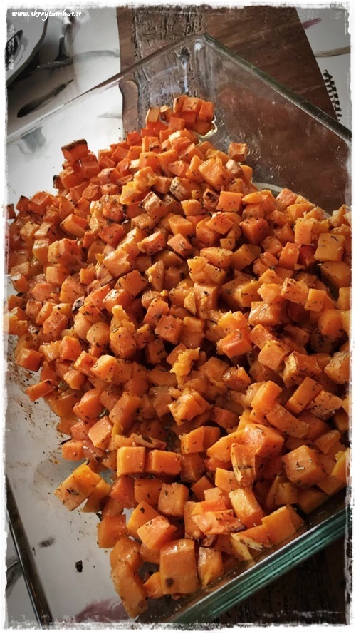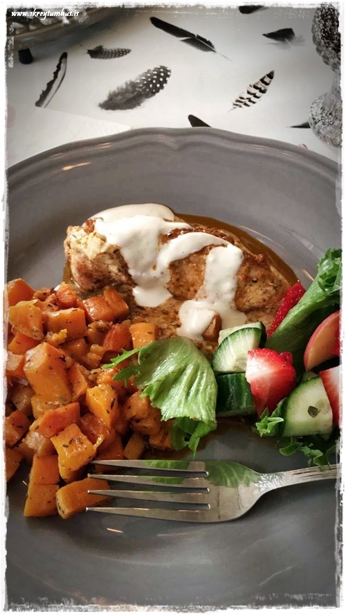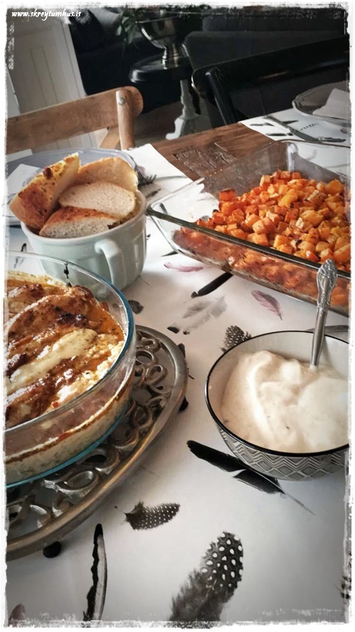Með þessu vorum við með sætar kartöflur. Skornar niður í teninga og settar í eldfast mót. Yfir þær er dassað olíu, salti og pipar, og smá Best á allt-krydd. Látið vera í ofni þar til þær verða mjúkar í gegn. Örlítið misjafnt eftir ofnum, ca 50 mín.