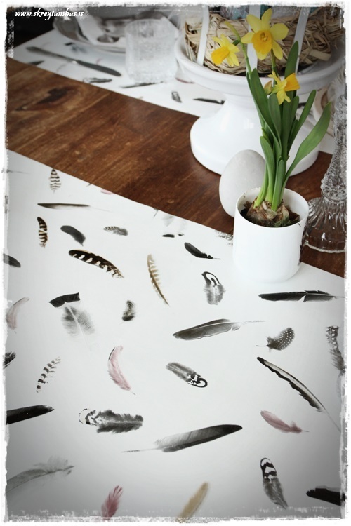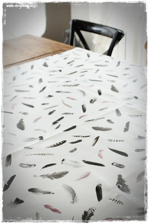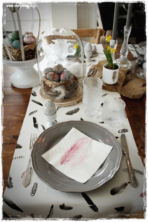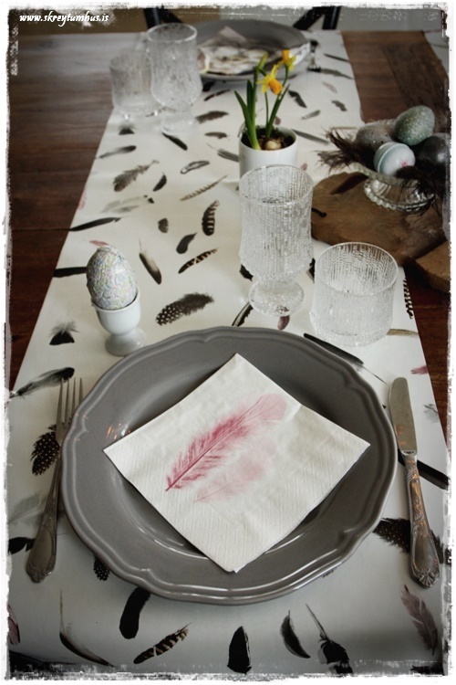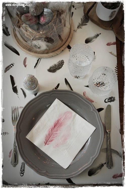 …hvítu servétturnar með bleiku fjöðrunum smellpössuðu inn í allar þessar fjaðrir og voru því kjörnar með! Þær eru gamlar úr Rúmfó…