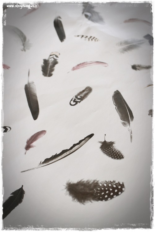 …á honum eru alls konar fjaðrir, í mismunandi litum, þó allar í daufum tónum fyrir utan þær bleiku.