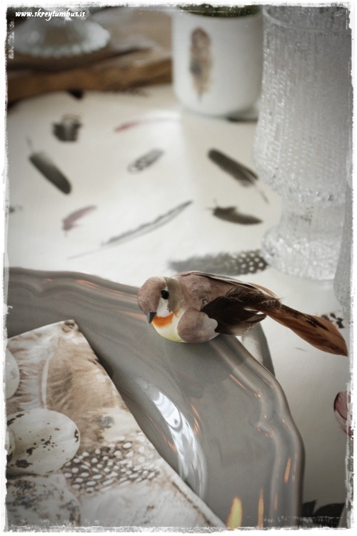 …tveir fuglar fengu að hvíla á diskum, enda er svona klemma á þeim þannig að það er auðvelt að koma þeim fyrir. Önnur leið væri líka að klemma þá á sérvétturnar og nota næstum eins og sérvéttuhring…