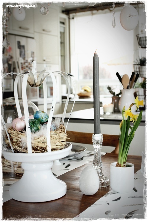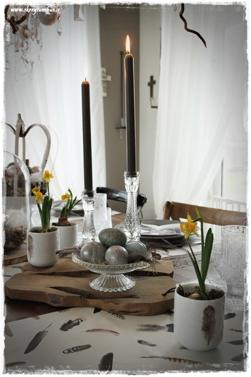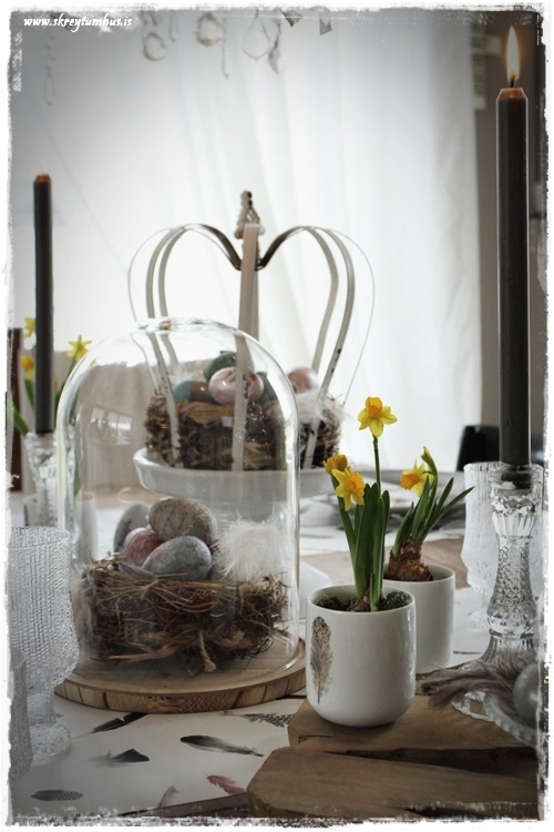 …ég stillti líka glerkúpli og kórónu á disk á fæti á borðið, setti í þau hreiður (úr Litlu Garðbúðinni) og síðan egg sem ég bjó til sjálf (sjá hér)…