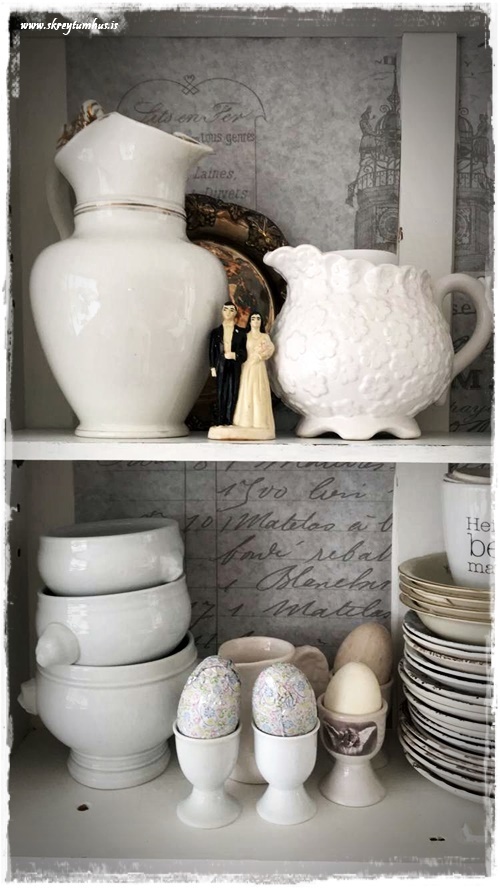 …áður en ég fór að taka út úr skápnum mínum gamla, þá smellti ég af nokkrum myndum.  Mér finnst það alltaf eitthvað svo fallegt að sjá blandað saman alls konar hvítu og gömlu og nýju…