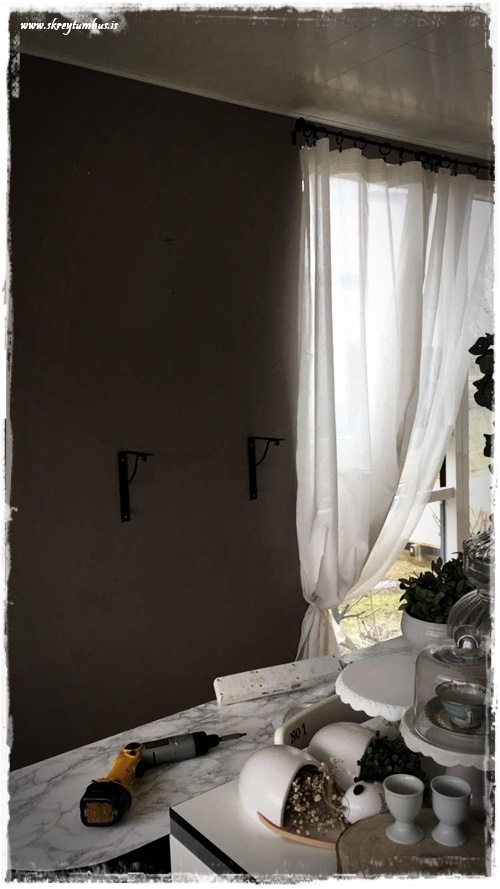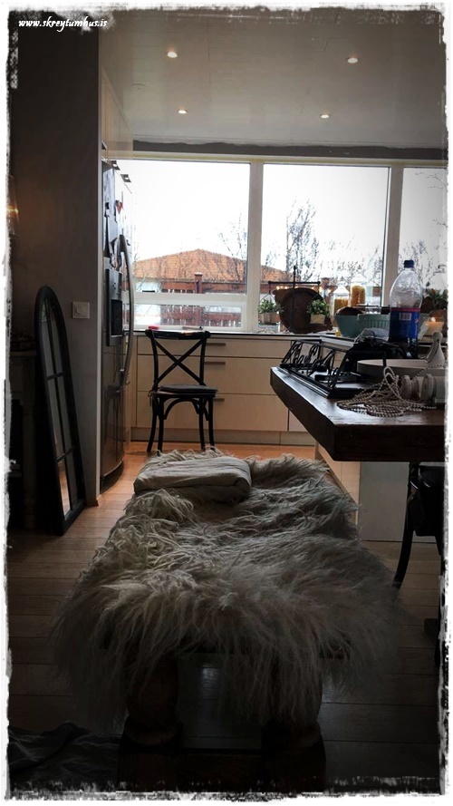 Ég var búin að sýna ykkur stofuna í vinnslu en eldhúsið var ekki komið hingað inn.  Eigum við ekki bara að dempa oss í draslið…