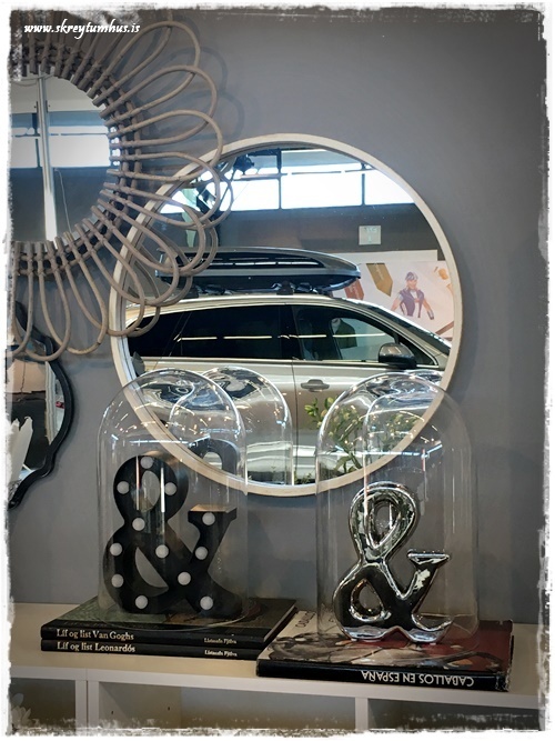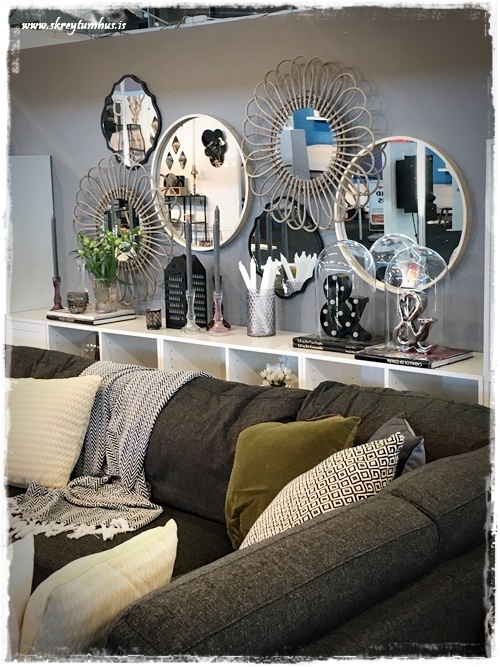 …yfir sófanum bjó ég til “listaverk” úr speglum. Þetta er einfalt en skemmtilegt, auðveld leið til þess að breyta rými og gefa því vídd. Auk þess sem að listaverkið breytist endalaust eftir því hvað, eða hver speglast í því.