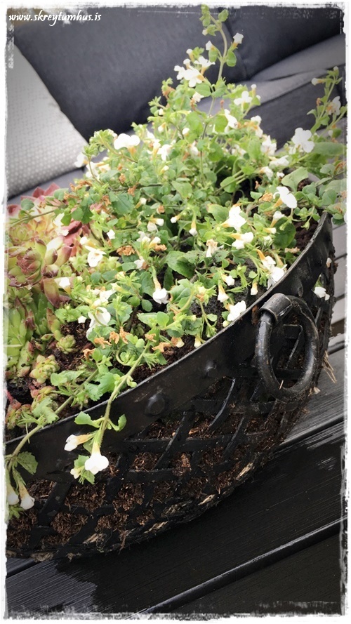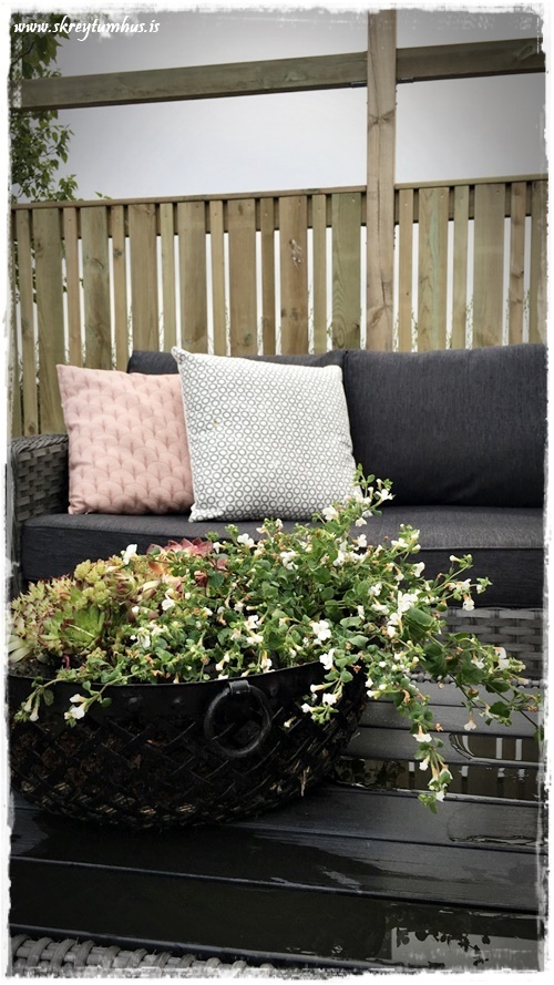 Mér finnst alveg nauðsynlegt að setja sumarblóm í potta og hafa hér fyrir utan, og auðvitað að nýja pallinum (sjá hér).