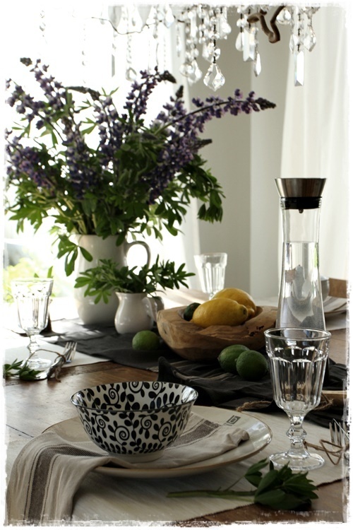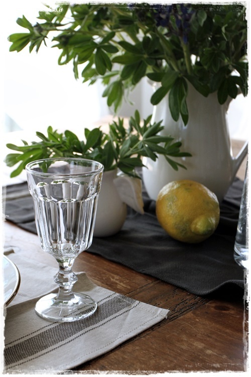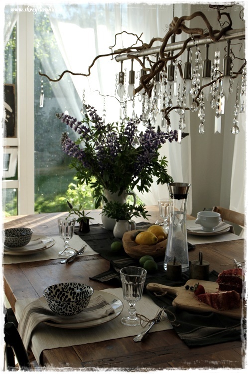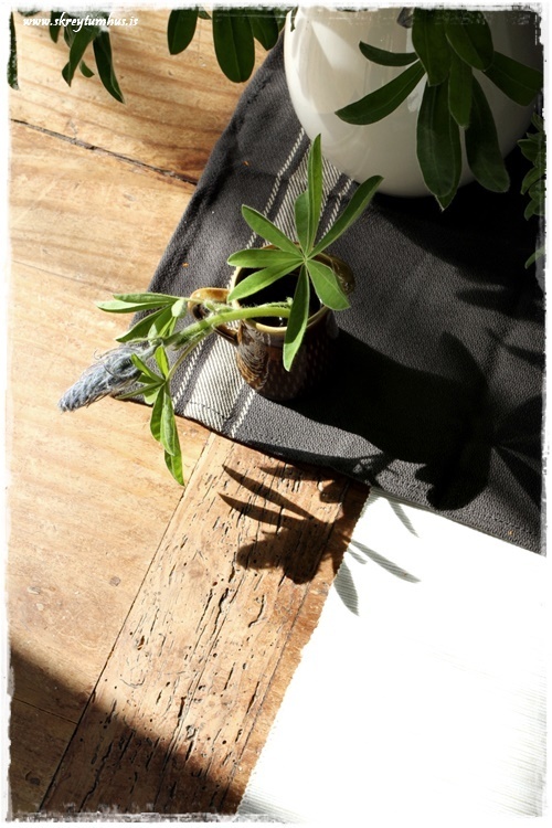 Smá svona sveitó, en ekki mjög litríkt borð, og þó – við erum með fallegu lúpínurnar…