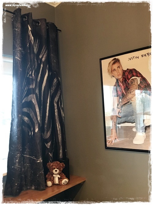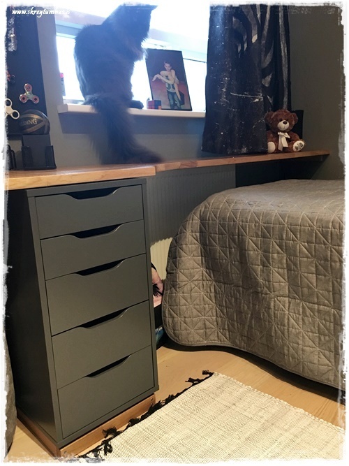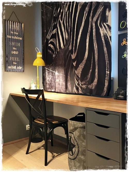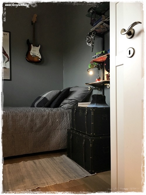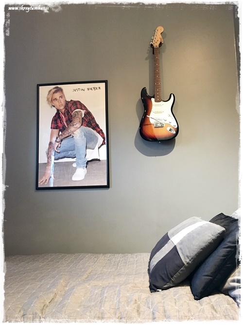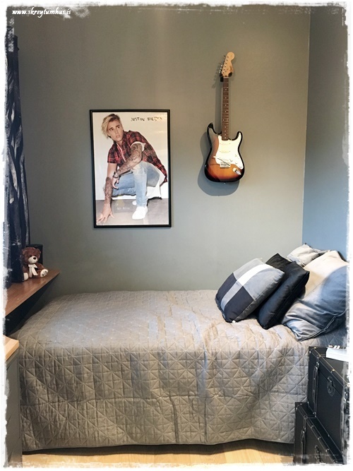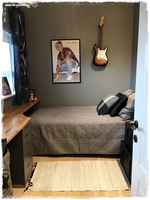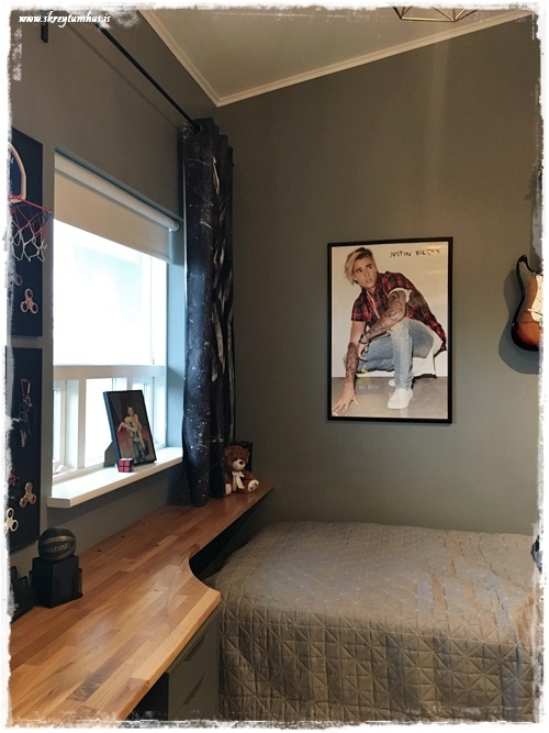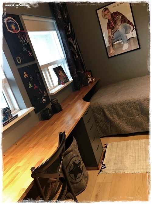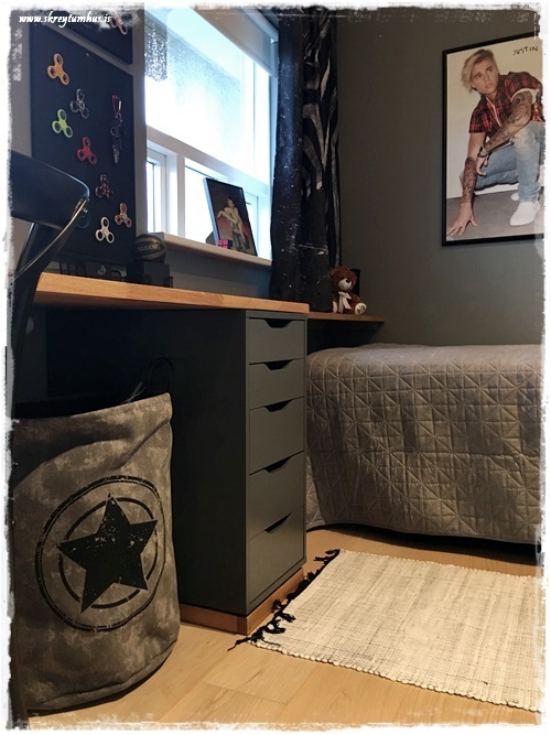…annað sem mig langar að benda á í þessu herbergi: það var ekkert keypt inn af svona “skrautmunum”. Allt sem er notað til skrauts er eitthvað sem ungi maðurinn átti sjálfur og var í herberginu hans áður.  Það sem við keyptum inn, var notað til þess að geta stillt upp hlutum sem til voru fyrir.  Eins og td. korktöflurnar fyrir spinnerana…
