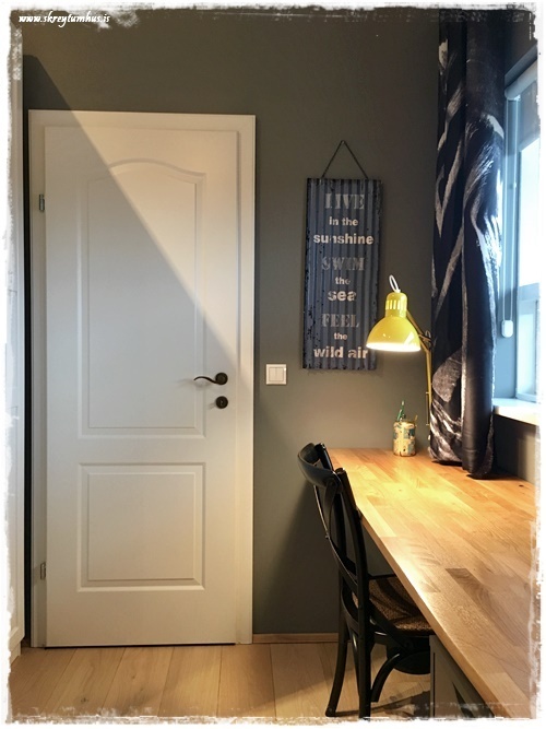…það voru líka óskir um að hafa herbergið í dekkri kantinum.  Jafnvel setja einn vegg í svartan lit.  En ég stakk hins vegar upp á að mála í Kózýgráum frá Slippfélaginu, sem er auðvitað einn af mínum uppáhaldslitum (sjá hér), og ég hræddi móðurina upp úr skónum þegar ég sagðist vilja láta mála alla veggina 🙂