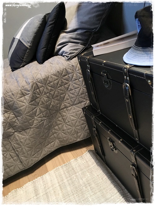 …rúmteppi og koddar eru líka alveg hreint snilld til þess að draga öll herbergi saman og gera þau kózý.  Önnur lausn, ef þið eruð með krakka sem vilja ekki búa um, er að kaupa bara falleg rúmföt.  Þá þarf bara að hrista upp í sænginni á morgnana.  En ungi snyrtipinninn hér, hann óskaði eftir rúmteppi, þvottakörfu og ruslafötu – vel upp alinn ungur maður 🙂