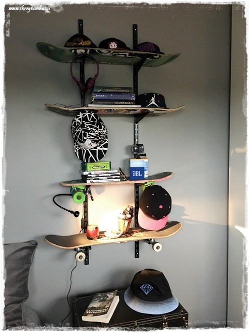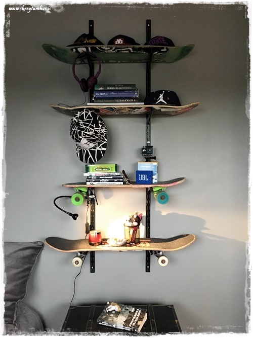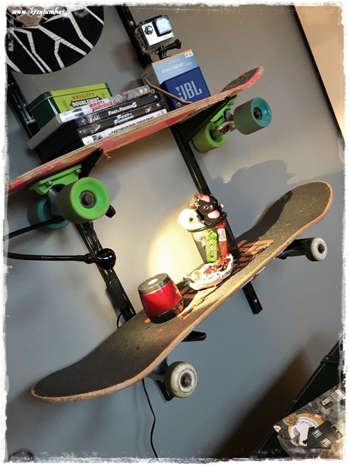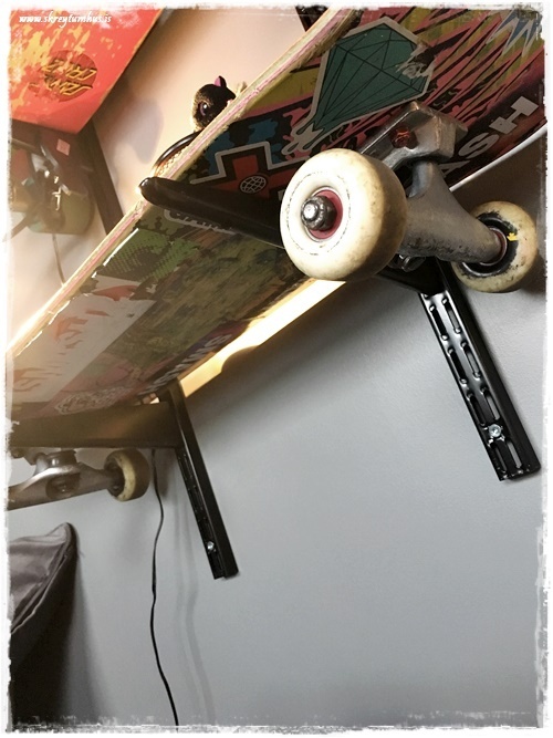 Við keyptum því festingar í Bauhaus, þær sömu og ég notaði á skrifstofunni (sjá hér), og settum á vegginn.  En í stað þess að nota hillur, þá notum við hjólabrettin sem hillur…