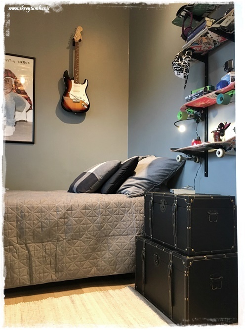 Þegar að hann vex upp úr að vera með hjólabretti, eða ef hann vex upp úr því, þá er auðvelt að svissa þessu út fyrir hillur og því má segja að herbergið komi til með að vaxa með honum…