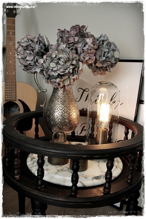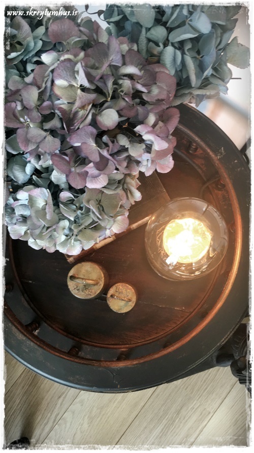 Hrikalega flott blómaborð 🙂 Alltaf gott að taka svona hluti sem hafa engin hlutverk og gefa þeim ný!