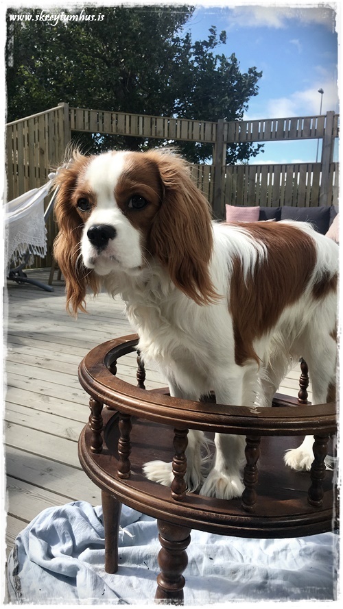 …ég og Moli ákváðum því að nýta einn góðviðrisdaginn til þess að taka borðið út á pall og mola mála það…