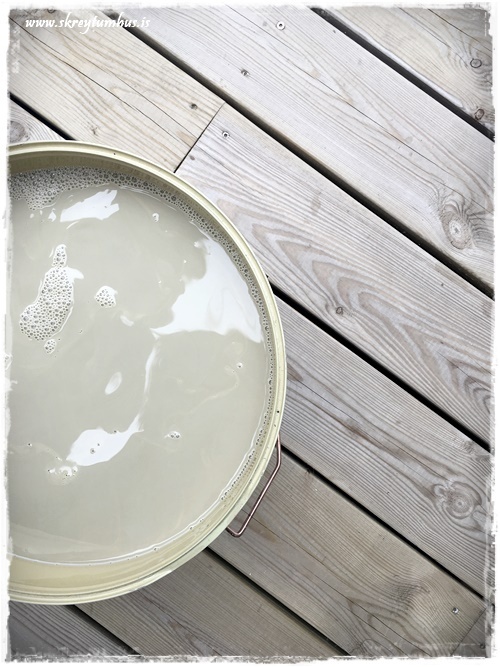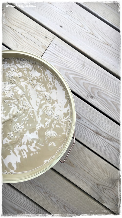 …eitt tipps sem við fengum og fannst mjög augljóst og skynsamlegt, em er alltaf gott að heyra: að þegar borið er á pallinn í framtíðinni, þá er gott að blanda sama litinn og þú notaðir áður, við glærann. Sem sé þynna hann út, því annars ertu alltaf að dekkja pallinn. Það er að segja, ef þú ert með dökkan lit…