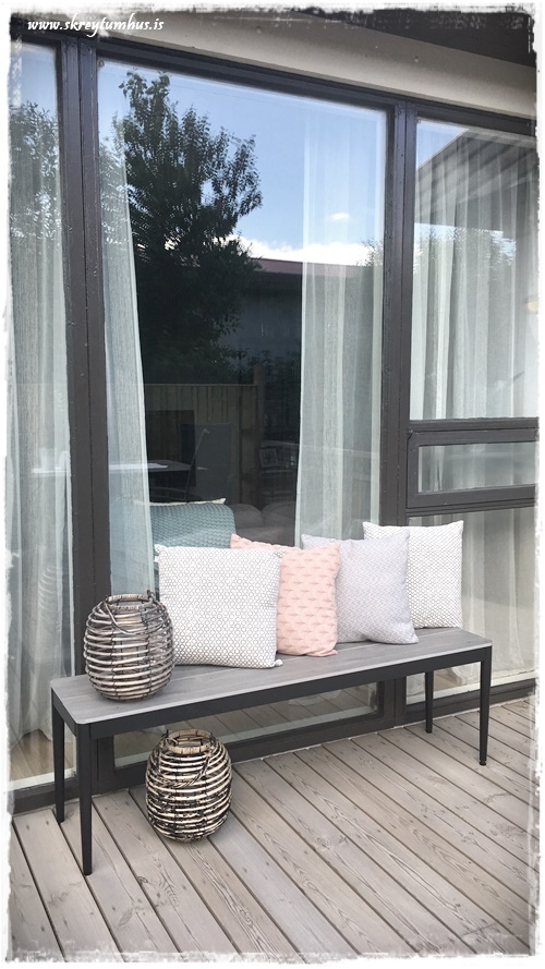 …þessi bekkur er undir þakskyggninu, og ég er búin að komast að því að þarna er fyrirtak að geyma púða stundum, þar sem það vill nú rigna á okkar fagra Fróni…