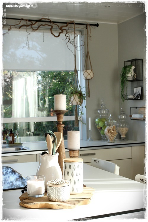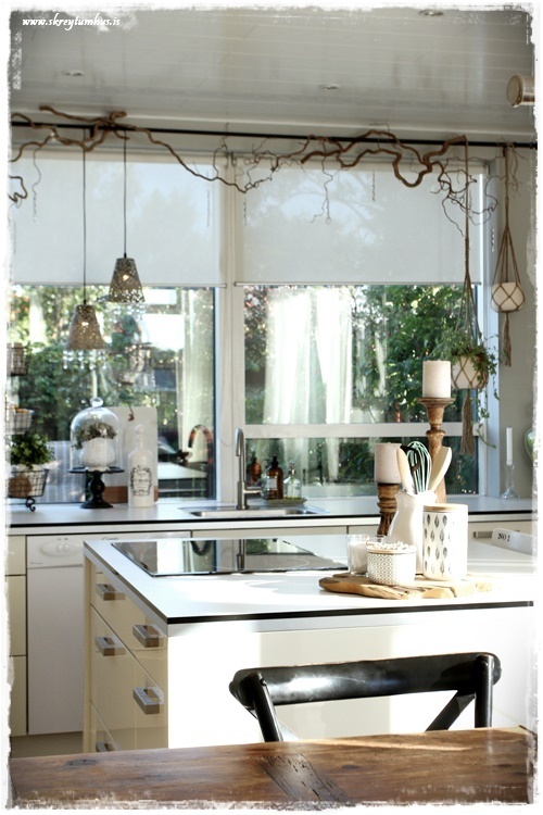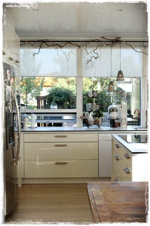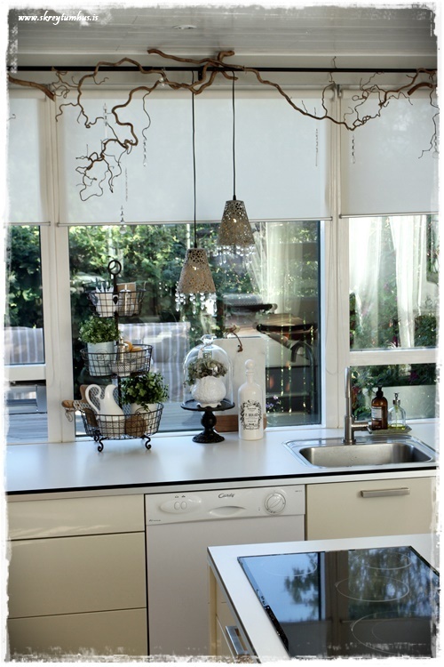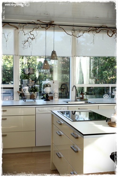 …sömu greinarnar og eru í eldhúsglugganum, eru í ljósinu yfir borðstofuborðinu…