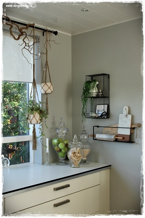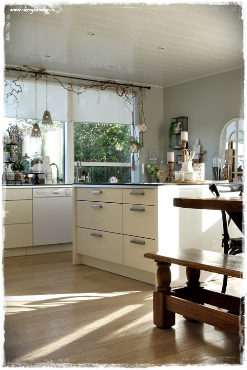 …ég er líka enn svo kát með gardínustöngina okkar, ljósin og greinarnar sem við settum upp…