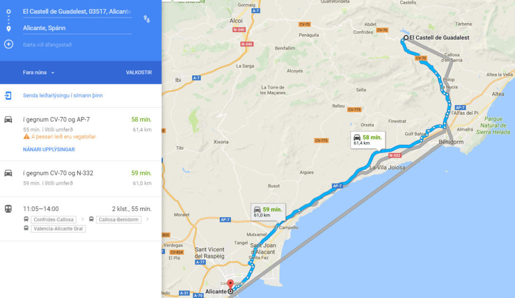 Í skemmtilegri ferð um fjöllin fyrir ofan Benidorm er ekið meðfram stöndinni og upp til fjalla. Komið er í fjallaþorpið Guadalest, sem hlýtur að teljast eitt sérstæðasta fjallaþorp Spánar og þótt víðar væri leitað.