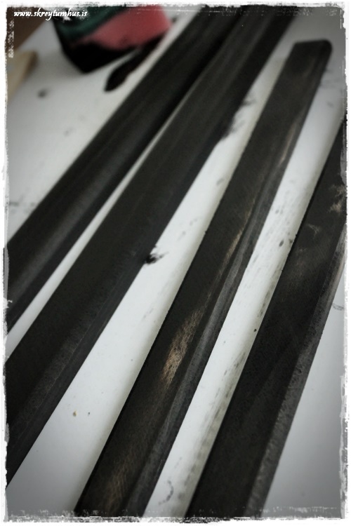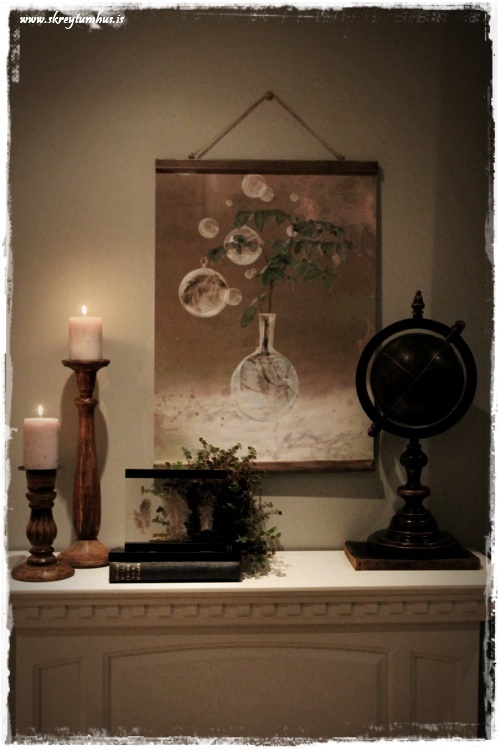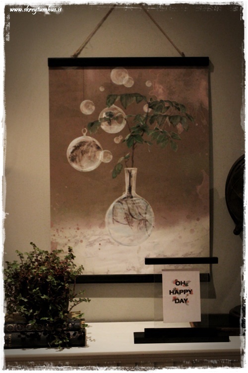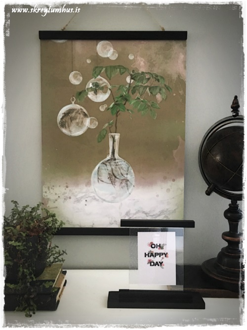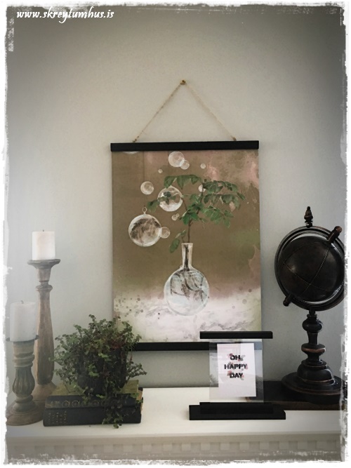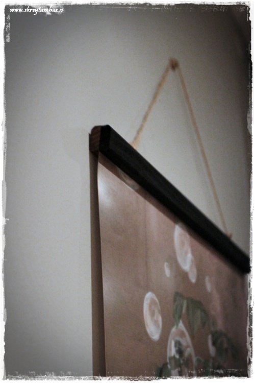 …og prufaði að skella þessu upp á vegg og ramminn á hilluna – og eins og sést þá er hérna viðaráferðin á spýtunum…