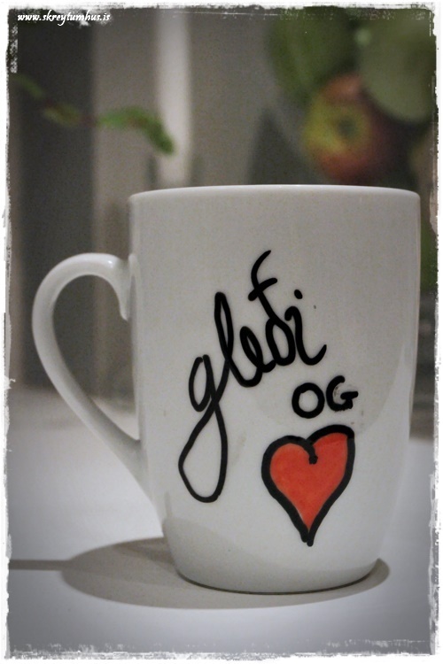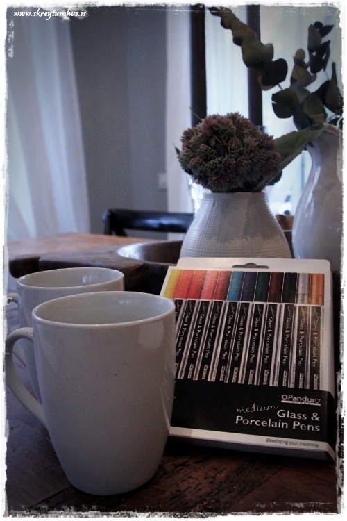 Ok, næsta verkefni sem var að heilla voru þessir hérna postulínspennar og bollar. Það er sem sé hægt að teikna/skrifa á bollana, setja þá svo inn í ofan í x-langan tíma, og la voila – þetta þvæst ekki af. Algjörlega snilldar jólagjöf fyrir ömmur og afa sem allt eiga og bara svo skemmtileg minning…